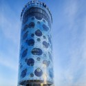 The outer shell of printed glass screens is mounted approximately 90cm off a solid lightweight inner façade with integrated fixed windows. The transparent shell has a noise reduction function. The cavity between the façades is used for accent lighting. The circular motif is applied on both shells of the building. The blue tinted patterns re-appear as frittings on the laminated glass, and create depth in the façade. On the façade of the pedestal, where the entrance and coffee shop are situated, curved clear glass is mounted. The building is illuminated at night by the hotel room’s windows and by light fixtures applied between the façade shells. Hence, the Fletcher Hotel is distinctly visible and identifiable in its surroundings, even after sunset.