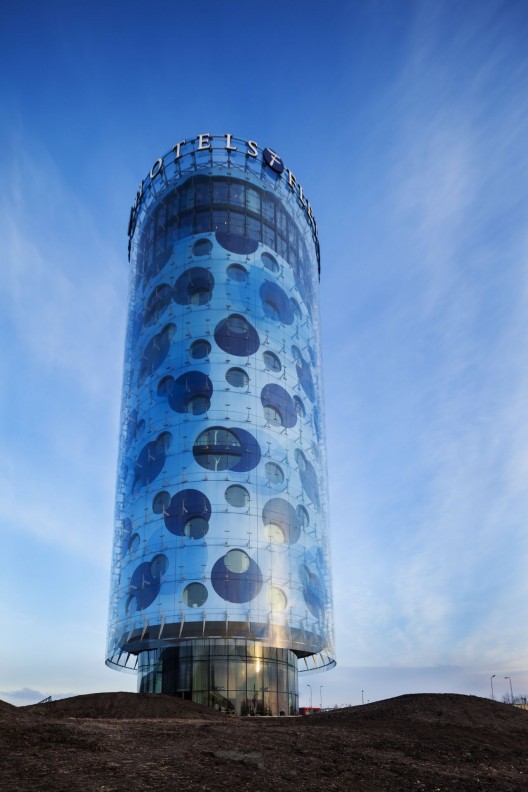 The fully glazed façade with its bend screens and round windows yields a distinctive, autonomous and yet restrained transparent appearance of the building, in its surroundings. The architecture of the neighbouring food strip is reflected in the circular motif in the hotel’s façade pattern. Blue colourings and shaded frittings provide a prominent outer shell to the building. Concurrently, by using this colour palette, the façade interacts powerfully with the sky.