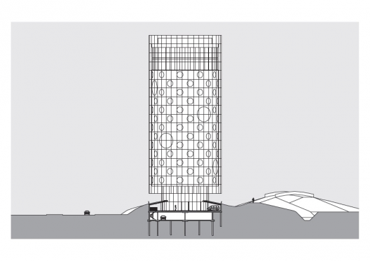 The 60 meter high hotel has a compact floor plan with a diameter of merely 24 meters, resulting in a characteristic slim silhouette alongside the highway. The objective to create an omnidirectional structure, with an expressive façade and a compact footprint, has resulted in a circular plan with a central core for elevators, stairs and service shafts. The limited space is used as efficiently as possible. The technical stem is girded by the main functions on every floor. Service areas and technical spaces are situated in the basement, in the pedestal or on the roof. The lobby and coffee shop are situated on ground floor. 120 rooms encircle the staircase and lifts in the heart of the hotel. On floor sixteen, five board rooms have been arrange in a manner that allows them to be linked together. The so-called ‘Skyrestaurant Pi’, on the top and eighteenth floor, just as well as ‘Skylounge Pi’ on the floor below, offer guests impressive 360° panoramic views over Amsterdam.