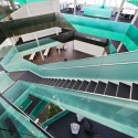The tips of this central space are “cut off” by walkways and workspace areas, dividing the atrium into a main space and three small atriums. The main space is slightly asymmetric and rotates for each floor, so that varied spaces with different floor-to-ceiling heights emerge, which makes the building flexible and usable in different working situations. Thus, the internal contact between functions increases and becomes much more varied than in a traditional atrium building. In addition, this strategy also meets the ambition of providing manifold of different spatial qualities, which employees can turn to according to needs, mood or project. The three small atriums contribute to the internal transparency by creating additional visual connections across the floors. Their distinctive spatiality can also be used to mark spots with specialized functions, e.g. break rooms, informal meetings etc.