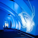 Also included in the space travel theme shown through Roszak’s plan are the many courses of the purposely “bent” shape of the gallery. These paths entice the adventurous explorer to wander along “shortcuts” of the free-flowing space just as a real astronaut would. The purpose of the twists and turns is two-fold since they also create opportunities for a collage of media learning displays. Extensive collaboration with experts in video, animation, sound, and lighting inspired interactive exhibits with layered projected images, motion- detecting light and sound effects, and unusual display technologies around every corner.