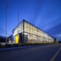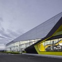 The architectural concept can be resumed essentially by the desire to express the internal activity of the building. Upon his arrival on the site, the visitor sees a large glass hall that show partially the internal activity of the exhibition center. The main hall contains the essential services and allows visitors to walk through a space flooded by natural light. The pixels pattern on the glass surface created by a semi-transparent film adds a light veil on the indoor activities taking places in the hall and adds a subtle texture to the glass wall. From the outside, the angular shape rises and highlights the main entrance. Sculpted and defined as a break of the glass block, the main entrance is the key element of the project and marks the transition between the exterior and the interior environment. The use of bright yellow color shows the internal activity of the exhibition center. This color sequence animates the facades like if the internal boiling energy was breaking up partly and shows the festive character of the place.
