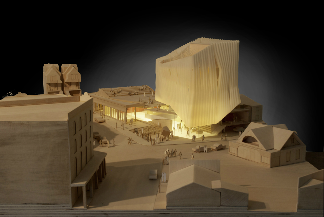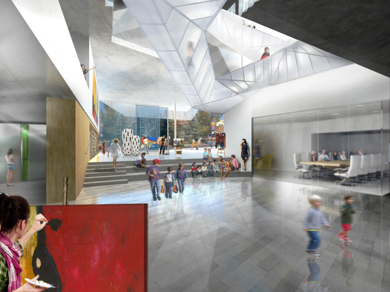 The proposal focuses on establishing strong connections with the Art Center and the public, expanding art into the broader community. As the working studio spaces are visually linked to the street corner, a passerby is not only directly connected to the art within the main exhibition space but they are exposed to the process in which art is made.
