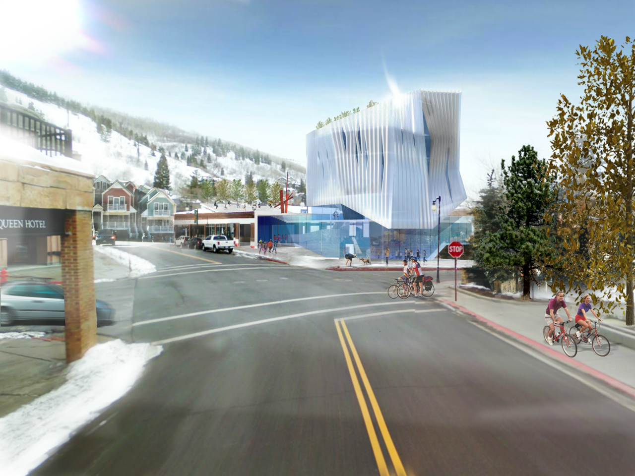 Capturing attention from a distance, the façade seeks to become a visual icon. The upper floors are composed of a conventional glazing system that is enclosed by a translucent honeycomb rain screen. The translucent faceted skin not only aides the buildings thermal performance, but transforms the Kimball Art Center into a glowing beacon within the streets of Park City.