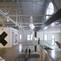 CAM’s director of development, Rosemary Wyche points out that much of the original fabric of the building, a produce warehouse with loading bays for trucks and a connection to a railroad spur, is largely intact, including the original apparatus for the freight elevator visible from the open stair to the museum’s main level. There the Main Gallery is revealed as a dramatic space with tall ceilings with the original metal trusses exposed and a row of porthole-like details that are part of the new ventilation and heating and air conditioning system. An original lunette window floods the space with light penetrating deep into the new basement gallery cut into the floor below. The lower level gallery’s square cast-in-place masonry columns with distinctive flared capitals and sheared caps have a delicacy of their own to complement to main exhibition space above. The lower level is also home to administrative offices, storage and preparation areas and the catering kitchen. The administrative area is defined by half-walls that give the basement a sense of openness. This level also accommodates one more exhibit space, the Media Lab, or Black Box Room, intended to display digital art and other technology.