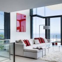 This element, which has a soft s-curve, contains the master bedroom and its ancillary spaces are separated from the living room double volume by a set of walnut shutters. “The building provides a volumetrically dramatic and dynamic interior space on a grand scale. The objective of the interior décor was to create a softer and intimate counterpoint whilst not jeopardising the clean, geometric lines of the architecture.