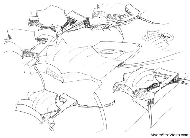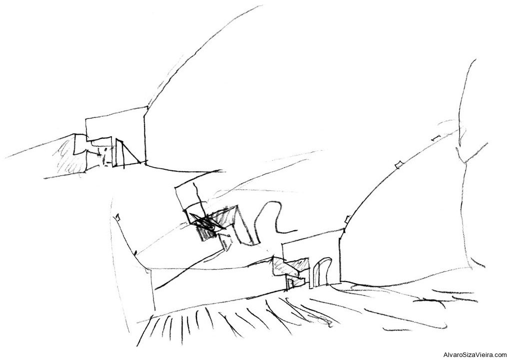 The site is an open space, shorn from the mountain, a square to be created. There are already compromises, perhaps they can be coordinated, even eliminated, we shall see. Back in Porto and the West. I try to transmit the experience, way of life, flavours and foundations of the work. Siza receives, perceives, questions and interprets like no other. From the first work session, a few timid, interpretive blueprints are made. The second session, supported by a model of the site, is more approximate, form becomes form, content in search of a programme. Other sessions follow, primarily on Saturdays and Sundays. The atmosphere is excellent. Models are built, scale is increased, the blueprints require alterations of the plans, models and 3Ds. It is necessary to return to Korea and present the project to the client