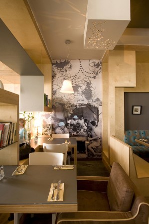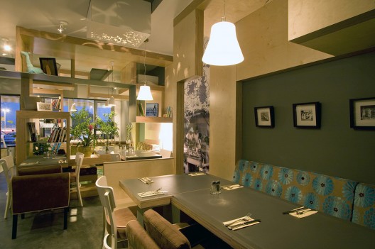 The project was planned as a complete project, in all its components designs – architecture, graphics, and architectural landscaping. The planning and execution included the close cooperation with the graphical designer, who designed the architectural graphics in harmony with the architectural geometry. A richness and synergy is created by the interaction of the two dimensional graphics and the three dimensional architecture. The graphical language of the site is repeated in the menu that was designed as a book, and thus changes the perusal of the menu into part of the architectural experience of the site.