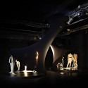 The stretched fabric shapes, produced by Fantasiarakenne, grow toward both the ceiling and floor. Each has a light cast from its core onto the collection, which is exhibited on the platform or plinth beneath. The lighting design, by Alpo Nummelin, sees the exhibits highlighted by light beams that burst through the dark and dense forest canopy.