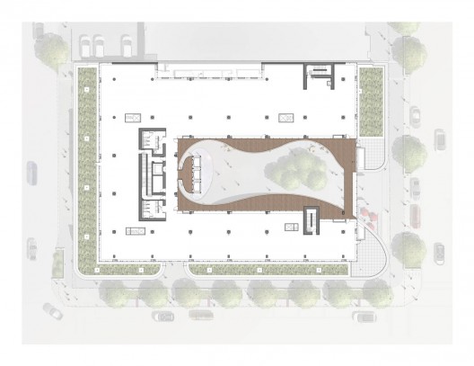 To create a more animated urban space, the project team commissioned an artist to design an installation for the atrium. This installation treats the atrium floor as a canvas for an abstract mosaic. The work is derived from the building’s lines and uses local marble tiles. Wood sculptures complement the mosaic’s lines, and provide places to sit.
