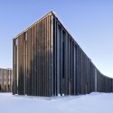 Plentiful use of wood was an easy choice for a building seeking to express Sámi culture. The facade is defined by massive, full-height vertical planks aligned to eavesline. They give the building monolitic character or varying degrees of transparency and detail depending on the angle one views the facades in. Behind the planks the facade is clad in vertical boards and glass. All timber in the facade is spruce, treated with iron sulfate.