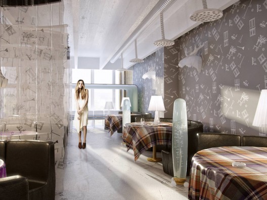 Chameleon is a design of a dynamic interior which adapts to changing environment and can serve various purposes. The interior of the restaurant adapts to changing environment in the same way as the chameleon changes its color depending on its mood. The created space of the restaurant constantly resorts to mimicry and adaptation.
