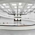 For visitors, the effect is that, looking out, they seem to be floating over the landscape. Visitors to the museum reach the upper levels via a spiral ramp. As the dominant feature, the ramp offers perspectives into the entrance hall and exhibition areas. Whereas the first to third floors are used solely for exhibition purposes, the fourth floor also contains conference rooms, research rooms, offices and the library. Air spaces there also accommodate particularly large exhibits. As in the circular central space, this means they can be given a setting, thanks to the indirect lighting from the roof lights arranged like windmill sails.